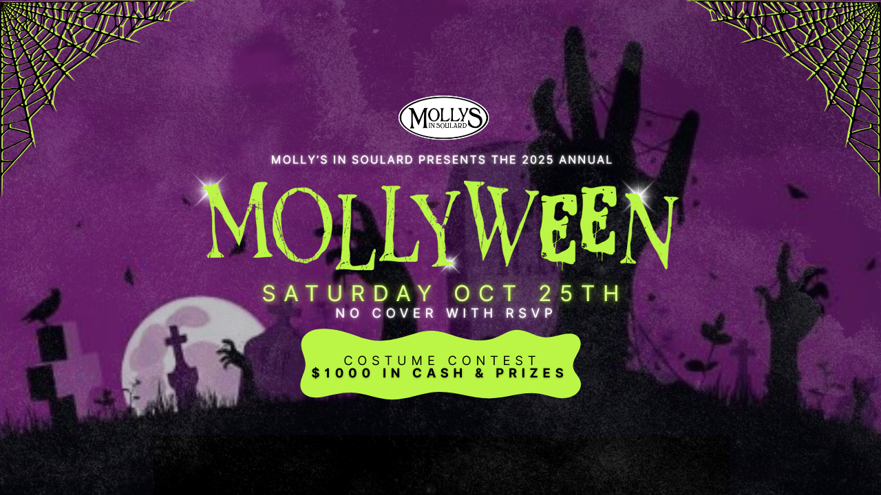 Spend a spooky evening on the patio celebrating our annual Mollyween Costume Bash! 6 bars open, 2 DJs, and a cash prize costume contest!